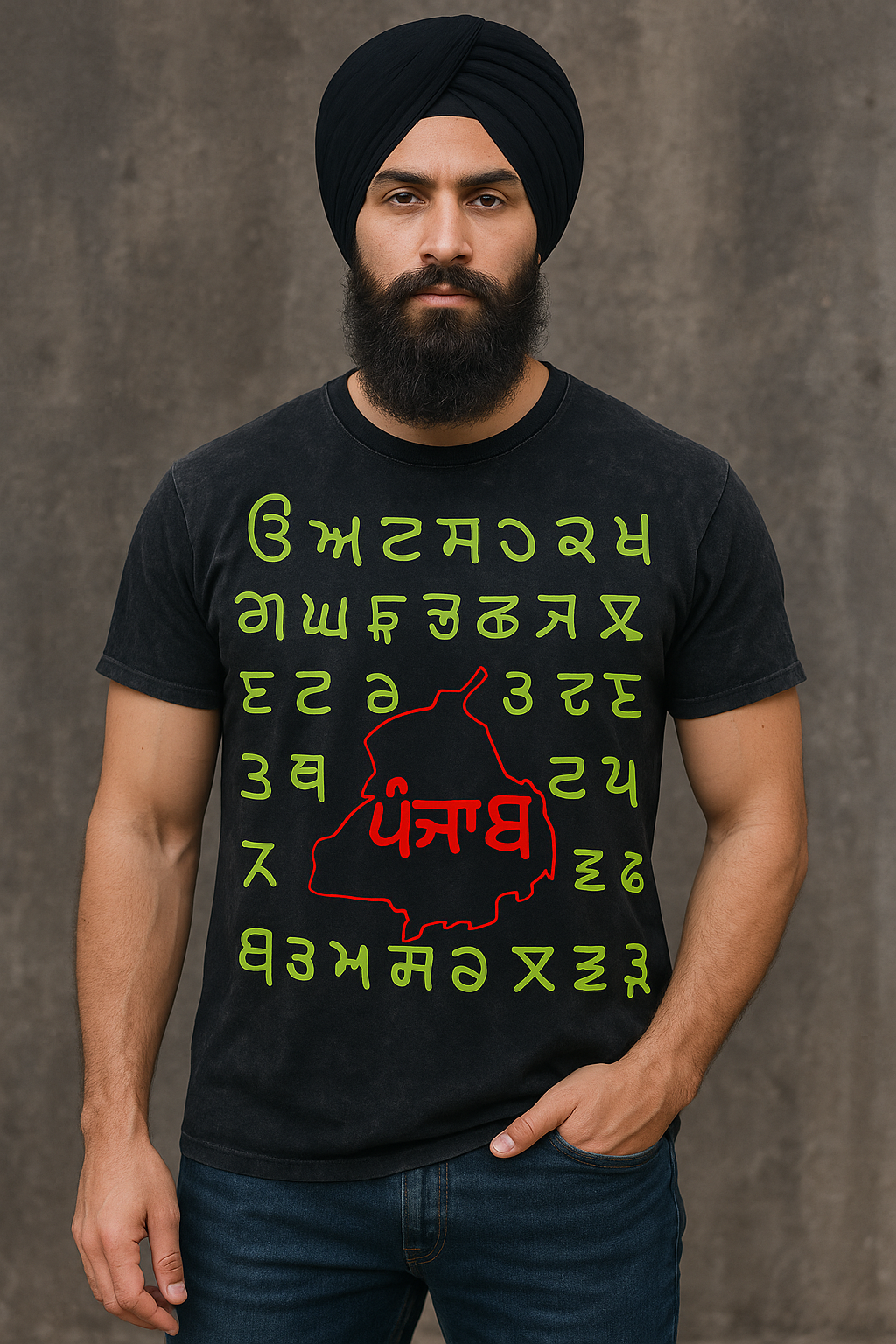 Showcase your pride and heritage with this unique Punjab Map Typography T-shirt. Featuring bold Punjabi letters and a striking red map outline printed large on a black acid wash tee, this shirt perfectly blends traditional script with modern streetwear style. Made from premium quality cotton, it offers a soft feel and a trendy faded look. Designed for the modern Sardar or anyone who loves Punjabi culture, this tee is perfect for casual outings, meet-ups, or as a meaningful gift. Make a statement, stay connected to your roots, and look effortlessly stylish.